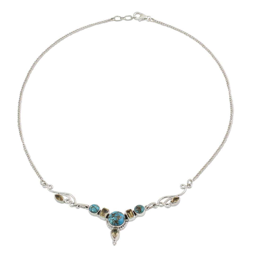 Over two carats of yellow citrine stones in a variety of eye-catching shapes adorn the pendant of this necklace, accompanied by round pieces of composite turquoise with beautiful blue hues. Presented by India's Neeru Goel, the pendant necklace is handcrafted from sterling silver for a beautiful, elegant appearance.