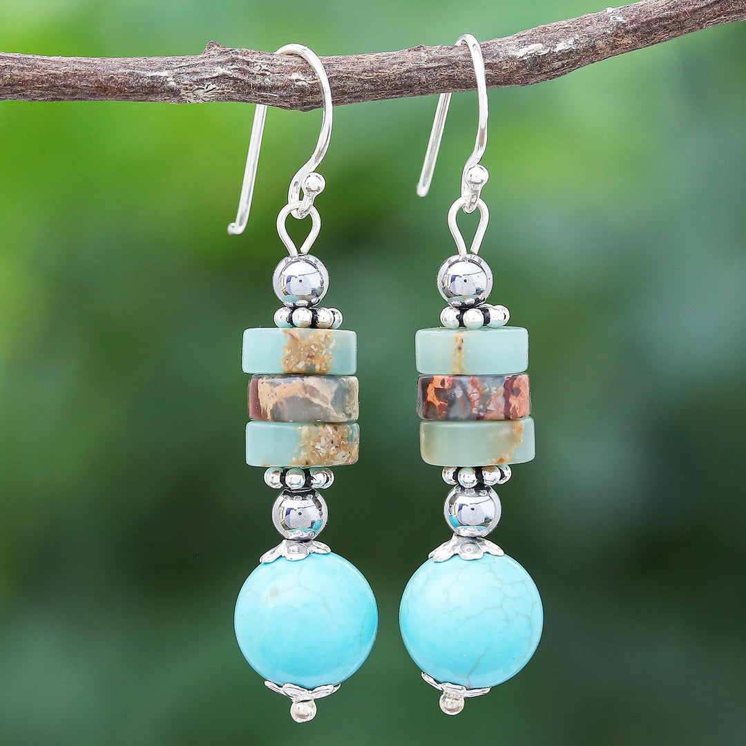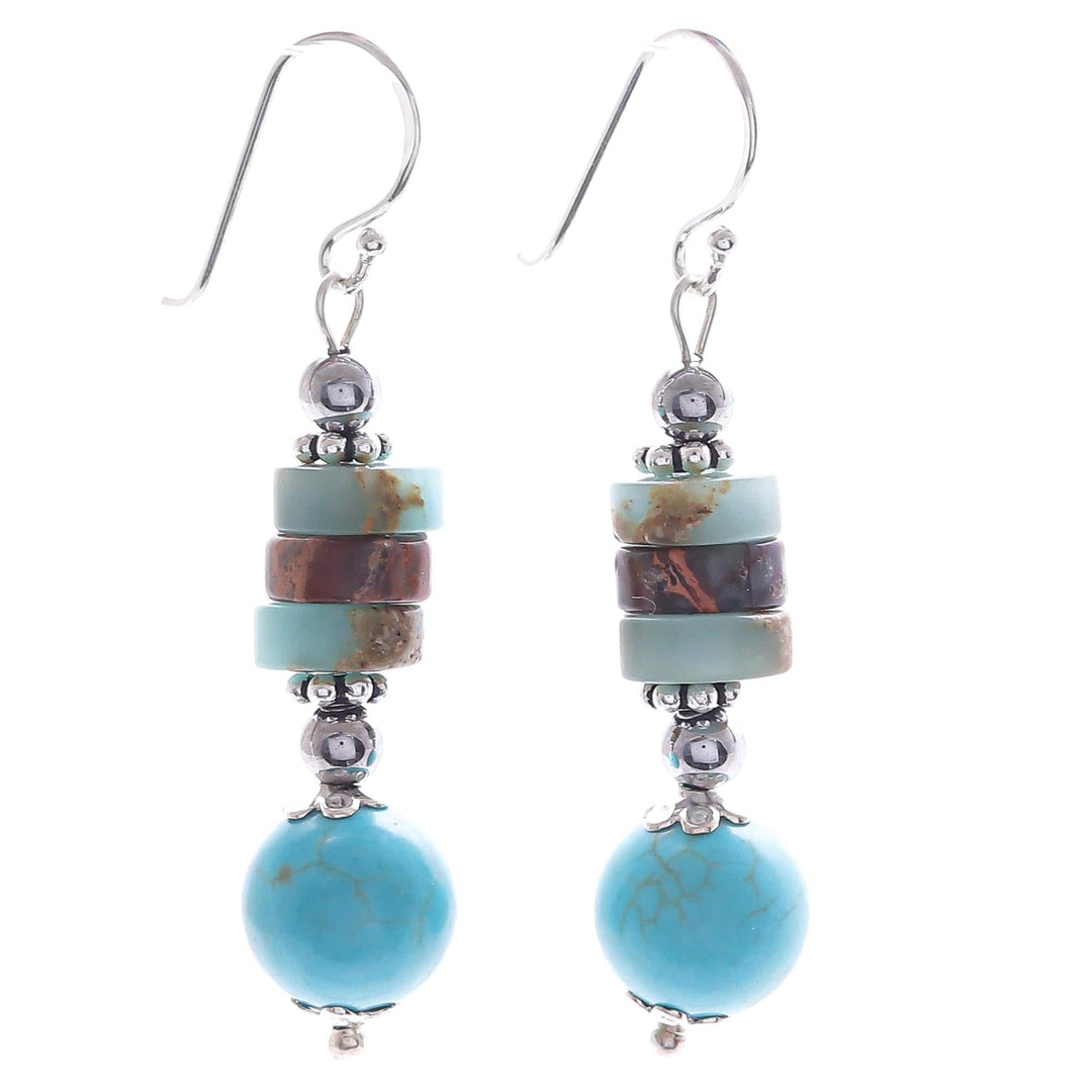 Tipa's gorgeous earrings capture the limitless possibilities of a wide open sky. The Thai artisan suspends globes of reconstituted turquoise from a row of complementary blue-brown jasper beads and hematite, adding 950 Karen silver flower beads and sterling silver hooks for a gleaming finish.
