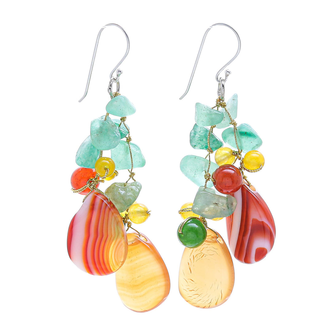 Fanciful candy-like gemstones in shades of turquoise, yellow, red, and green are hand-tied to create these spirited dangle earrings on sterling silver hooks. Nareerat of Thailand uses silk thread to unite chips of aventurine with round quartz beads and pear-shaped chalcedony and carnelian stones.