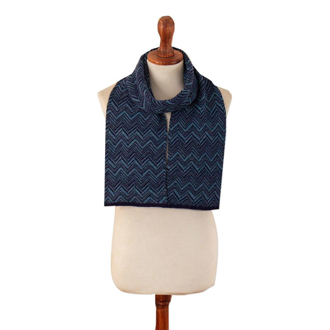 100% Alpaca Knit Scarf with Inverted Chevron Pattern in Blue - Mountain Range