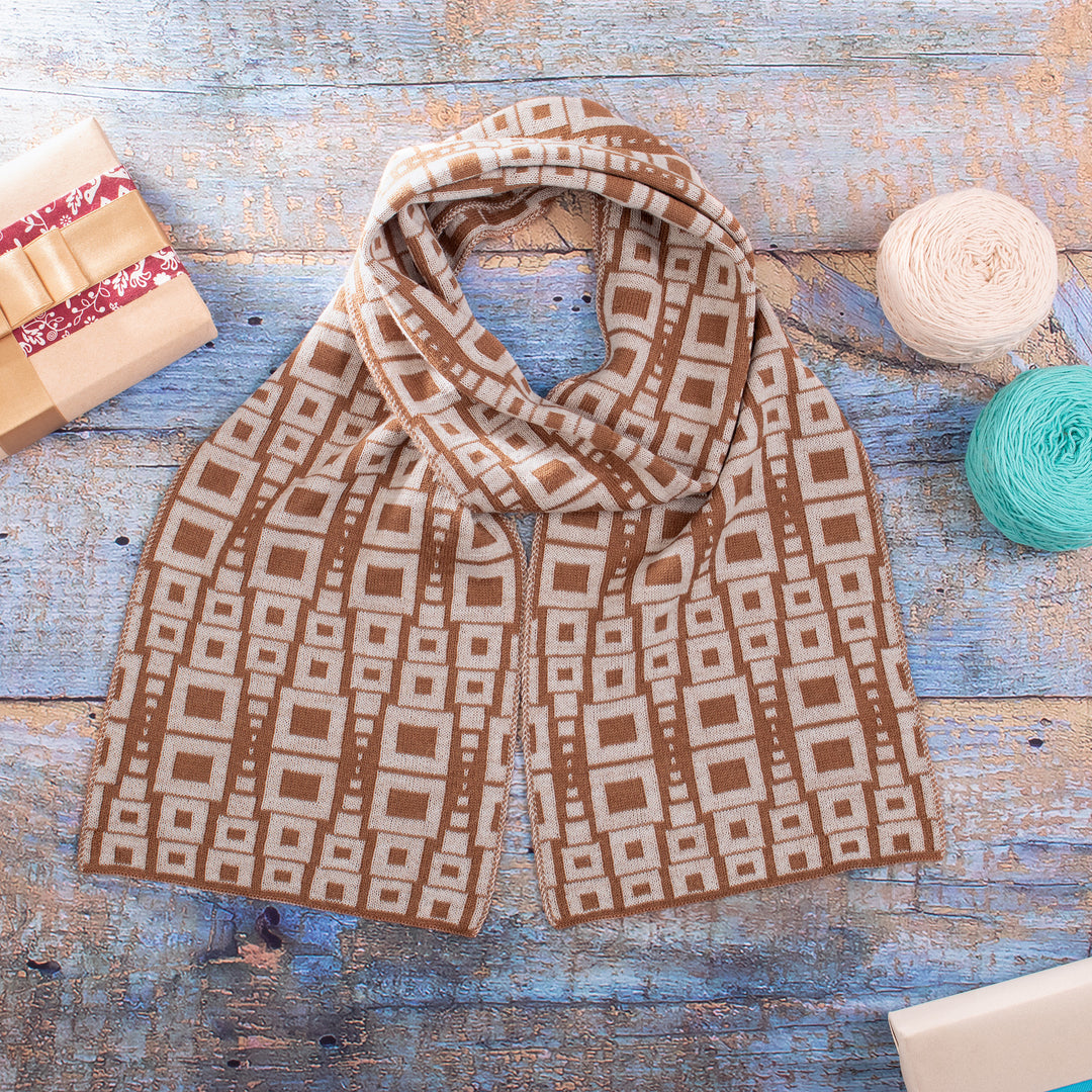 Intricate square motifs in eggshell decorate the golden brown body of this Peruvian wrap scarf. Designed by Waldo Berrios, the scarf is knit of alpaca blend yarn, resulting in a soft, comfortable cold weather accessory.