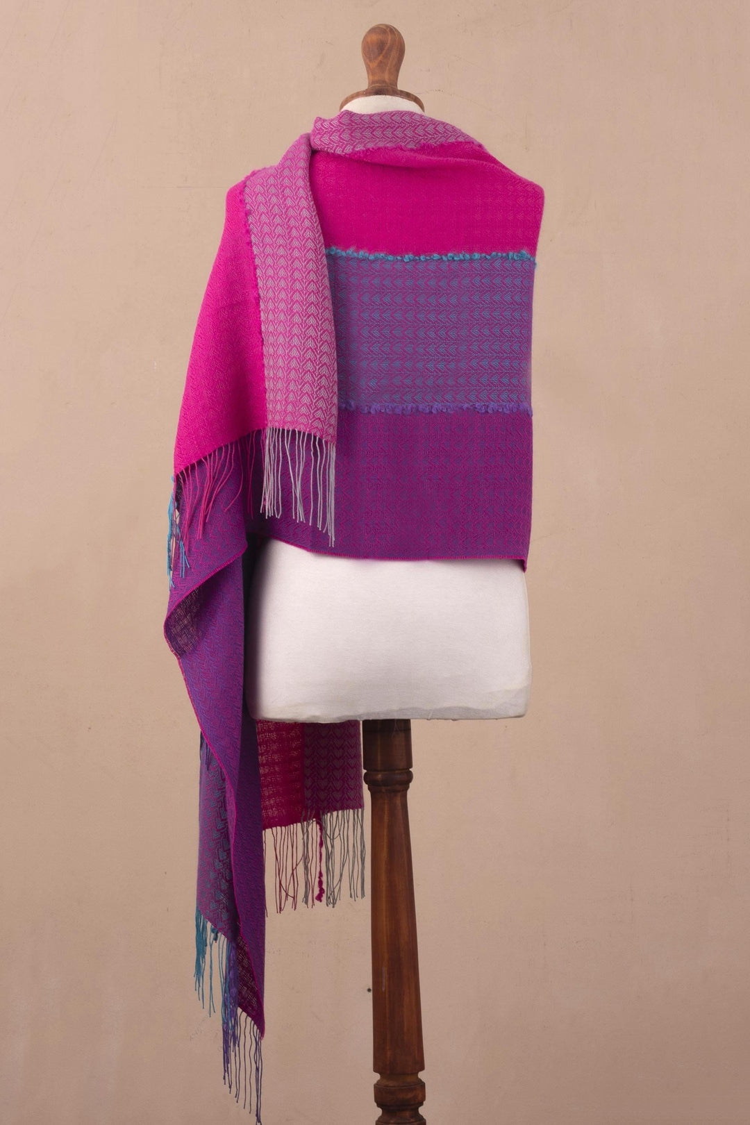 This lightweight and cozy shawl made from baby alpaca and pima cotton blend is the product of Peruvian artisans Raquel and Gregor, who hand-weave it in four vibrant stripes in hues of purple and fuchsia with a subtle arrow pattern, finishing it with a fringe on both ends. This shawl will be the perfect accessory for cold winter days.