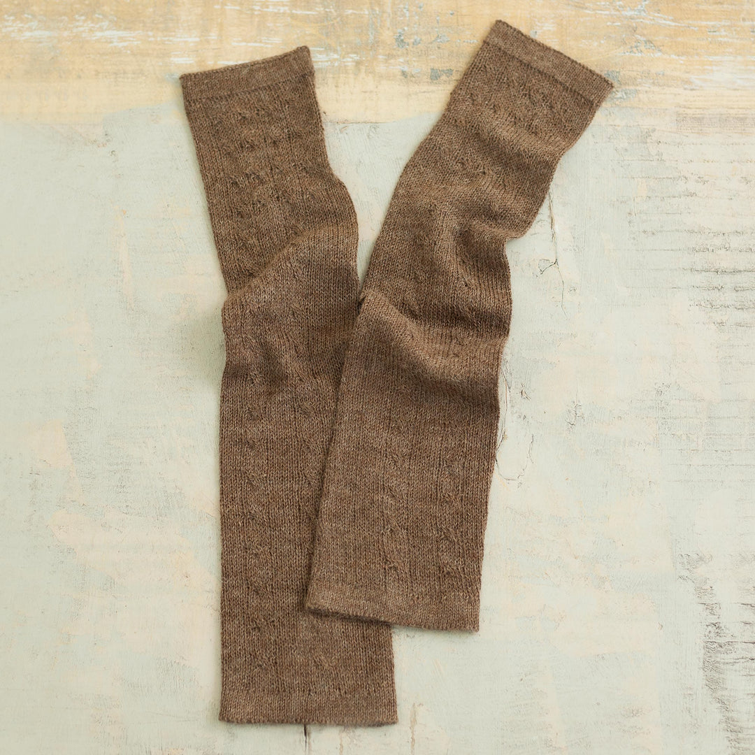 Alfredo Falcon of Peru designs a luxuriously soft pair of long fingerless mitts made of 100% baby alpaca, the fine fleece from the first shearing of the season. In a rich chestnut color, the warm and cozy mitts feature a cable knit pattern.