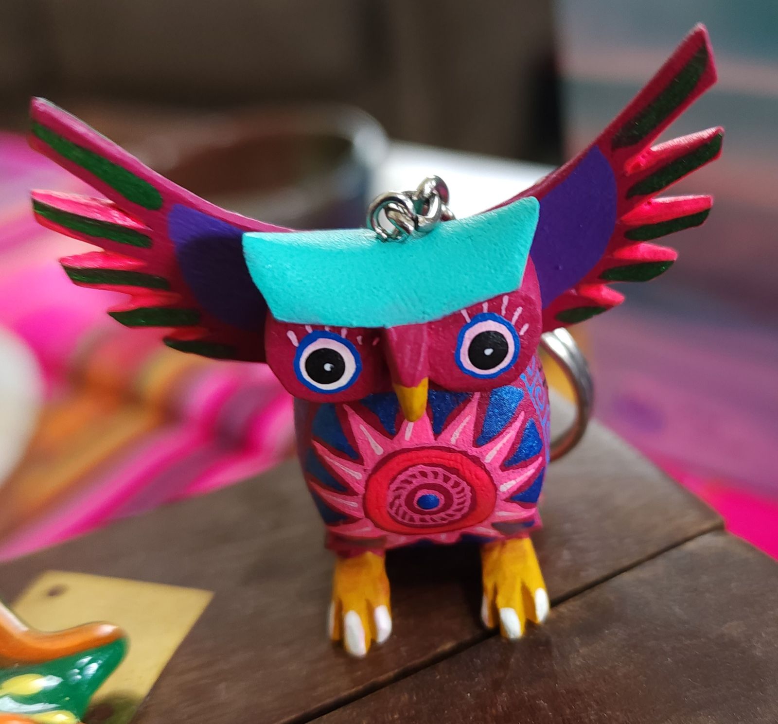 This adorable key fob is hand crafted by Claudio Ojeda in Mexico. The owl alebrije is carved from copal wood and painted in magenta and a colorful array of patterns and shapes. The wood figurine adorns a stainless steel key ring. The artisan signs his pieces with the initials 'T.C.', which represent his initial 'C' preceded by his mother Teresita's initial 'T'. Claudio learned the art of crafting alebrijes from his mother.