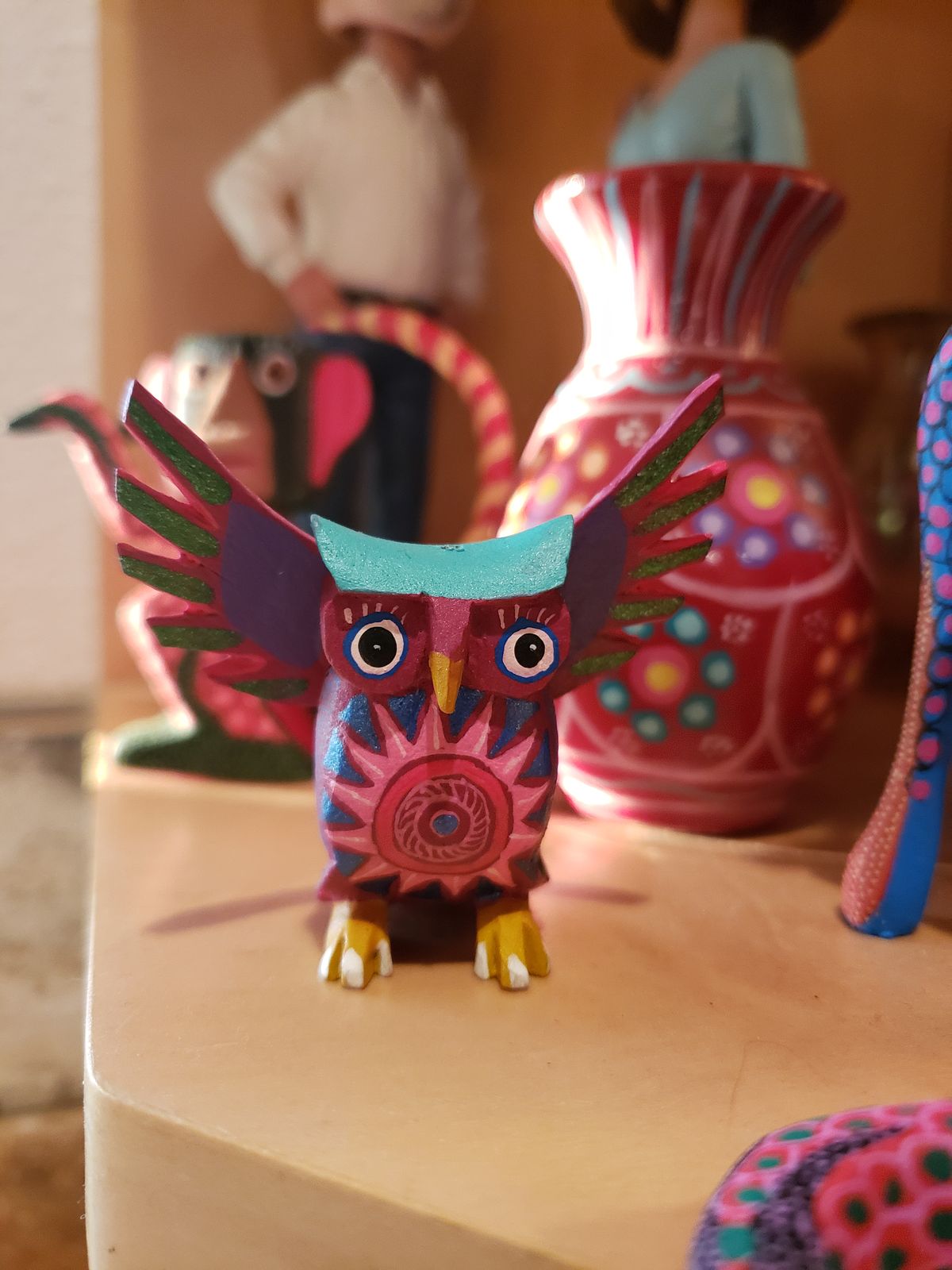 "Since 2013, I've participated in cultural events for museums and foundations at the national level. I still live in Oaxaca, which is the birthplace of copal wood alebrije art. I've continued developing my technique and also work with my mother. I want to demonstrate the principles she taught me through my crafts, which are loyalty, honor, respect for the family and love for my work. I believe that every day is a struggle and, in that struggle, alebrijes are our guardians."