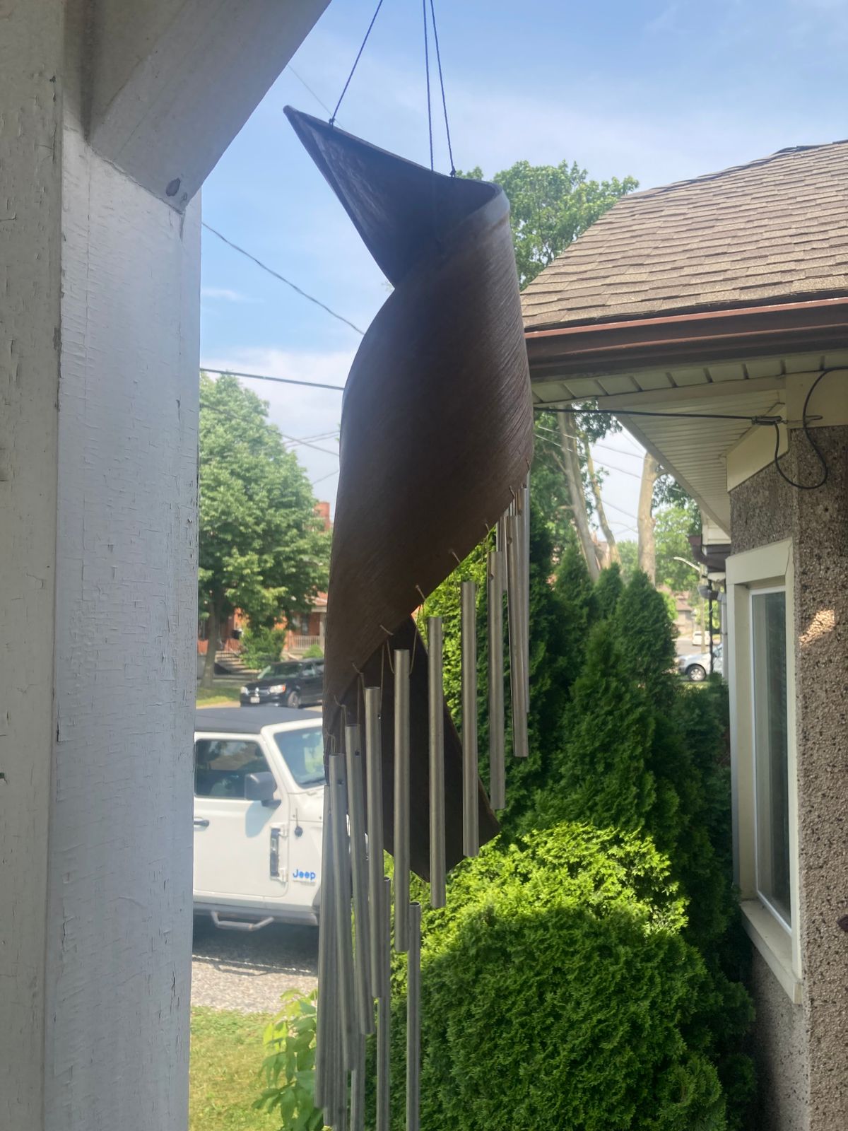 Balinese artisan Trisna Dewi designs this charming handmade wind chime using a part of the coconut tree called 'kloping' or calyx. Kloping is brown in color and protects the coconut flower and fruit like a shell, and it's common for traditional Balinese artists to use this part of the tree in their crafts. The whimsical piece of kloping creates a slender, minimalist curve, and the hand-tuned aluminum pipes send serene notes through the air whenever the wind blows. This would make a lovely accent inside the home, and if used outside the calming sounds will brighten any atmosphere.