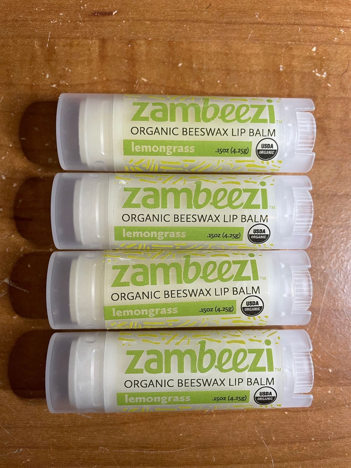 Refresh your lips with your new Zambeezi lip balm that has a wild gingery lemongrass flavor - made with Fair Trade, organically grown ingredients.