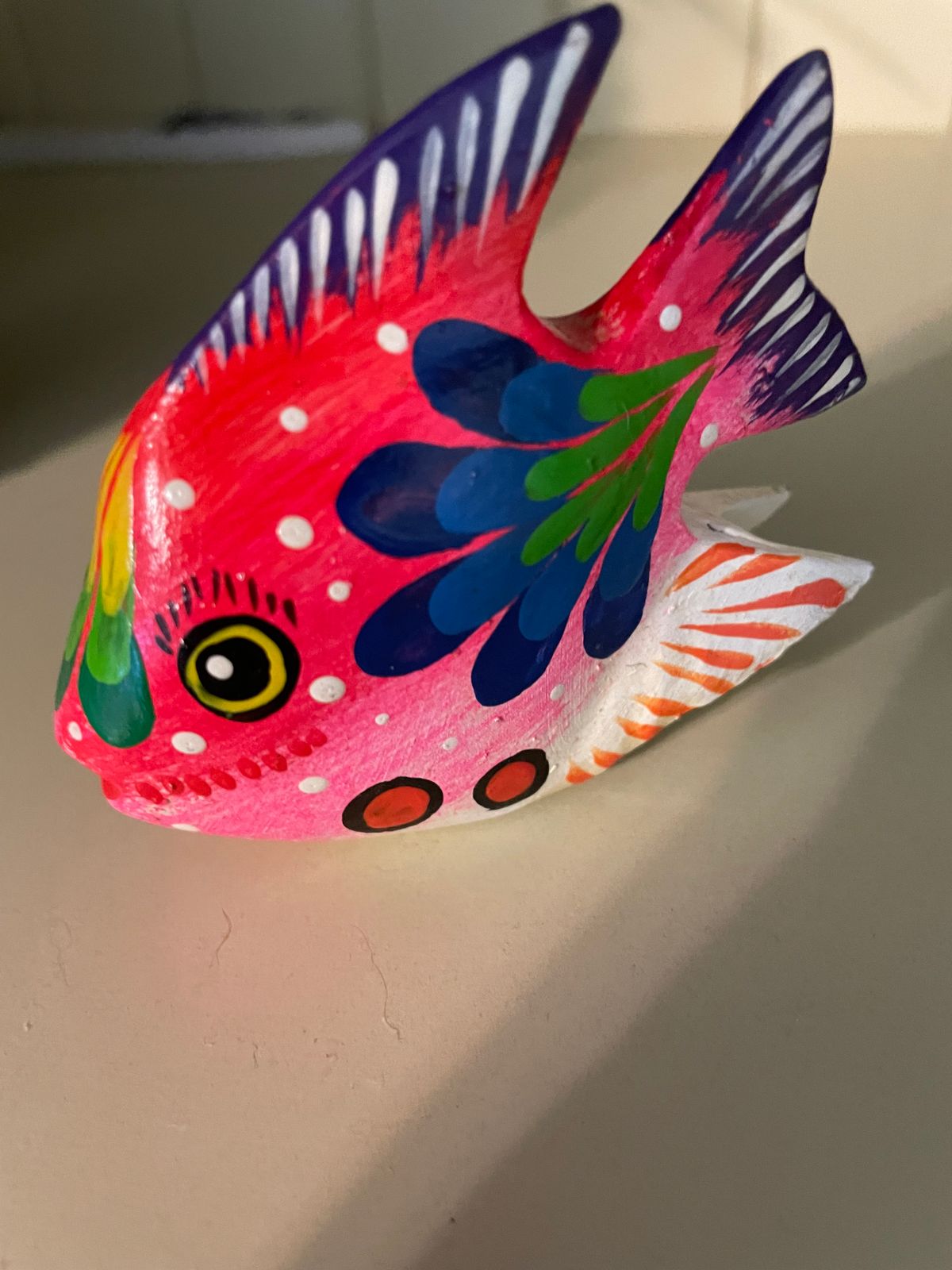 Inspired by the Mexican folk art form of alebrijes, Manuel Delfino in Guatemala creates this sweet figurine. The artisan carves and paints the fish figurine by hand in colorful detail.