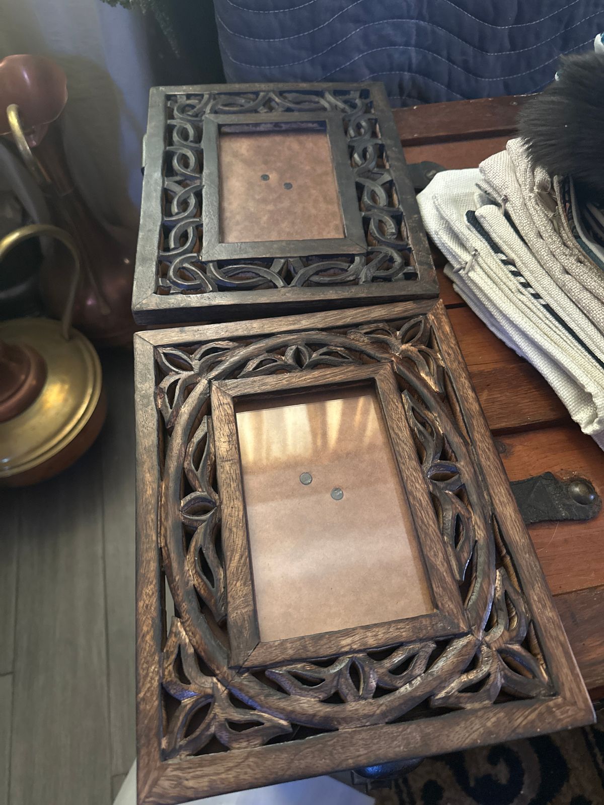 Kamal of India presents this lovely mango wood photo frame with an antique finish. The rectangular frame features hand carved cut outs of an oval surrounded by leafy fines with open leaves. The frame includes a protective glass pane and fits 4x6 vertical photos.